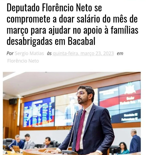 A iniciativa do deputado estadual Florêncio Neto (PSB) em doar seu salário do mês de março para ajudar no auxílio às famílias atingidas pela enchente do Rio Mearim em Bacabal, tem repercutido bastante e de forma positiva. Nas redes sociais e na imprensa de todo o Maranhão o parlamentar foi elogiado.